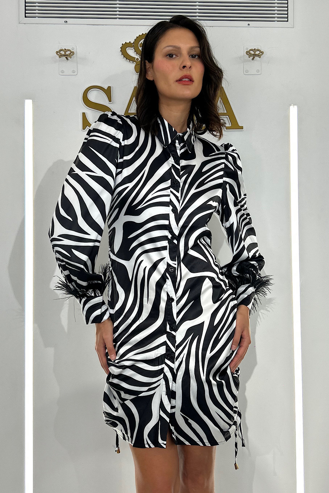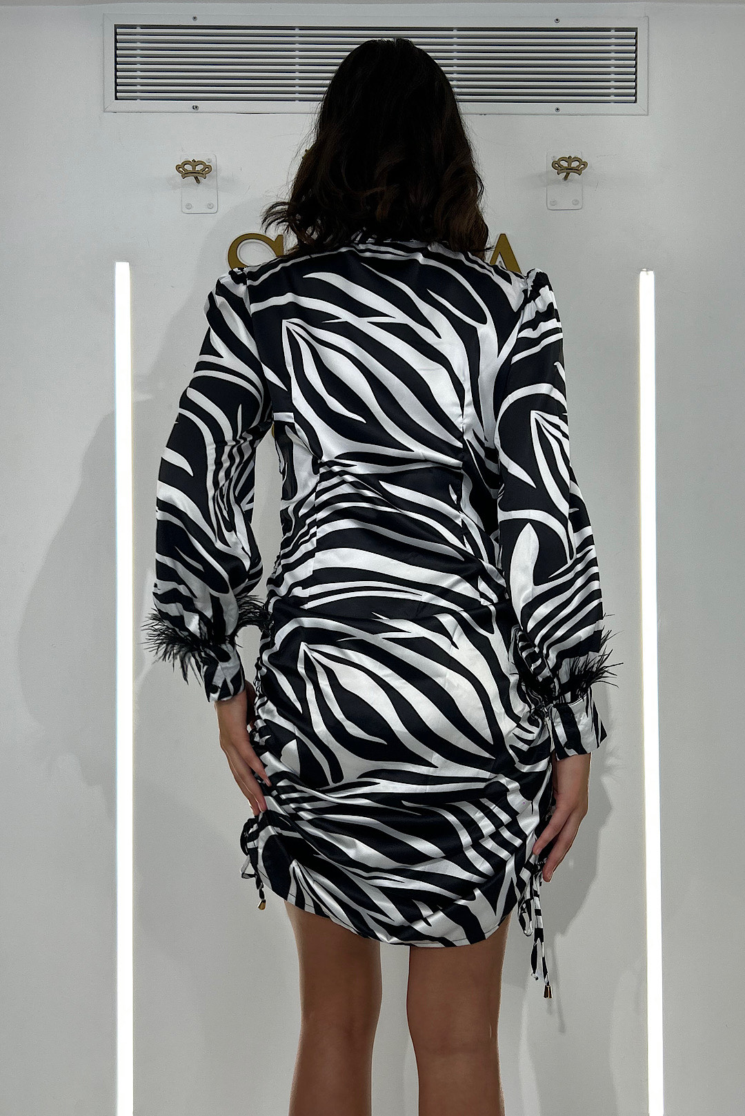 Μπορείς να το κάνεις είτε mini είτε midi , έχει εντυπωσιακά φτερά στα μανίκια και χρυσές μεταλλικές λεπτομέρειες στο τελειώμα των κορδονιών