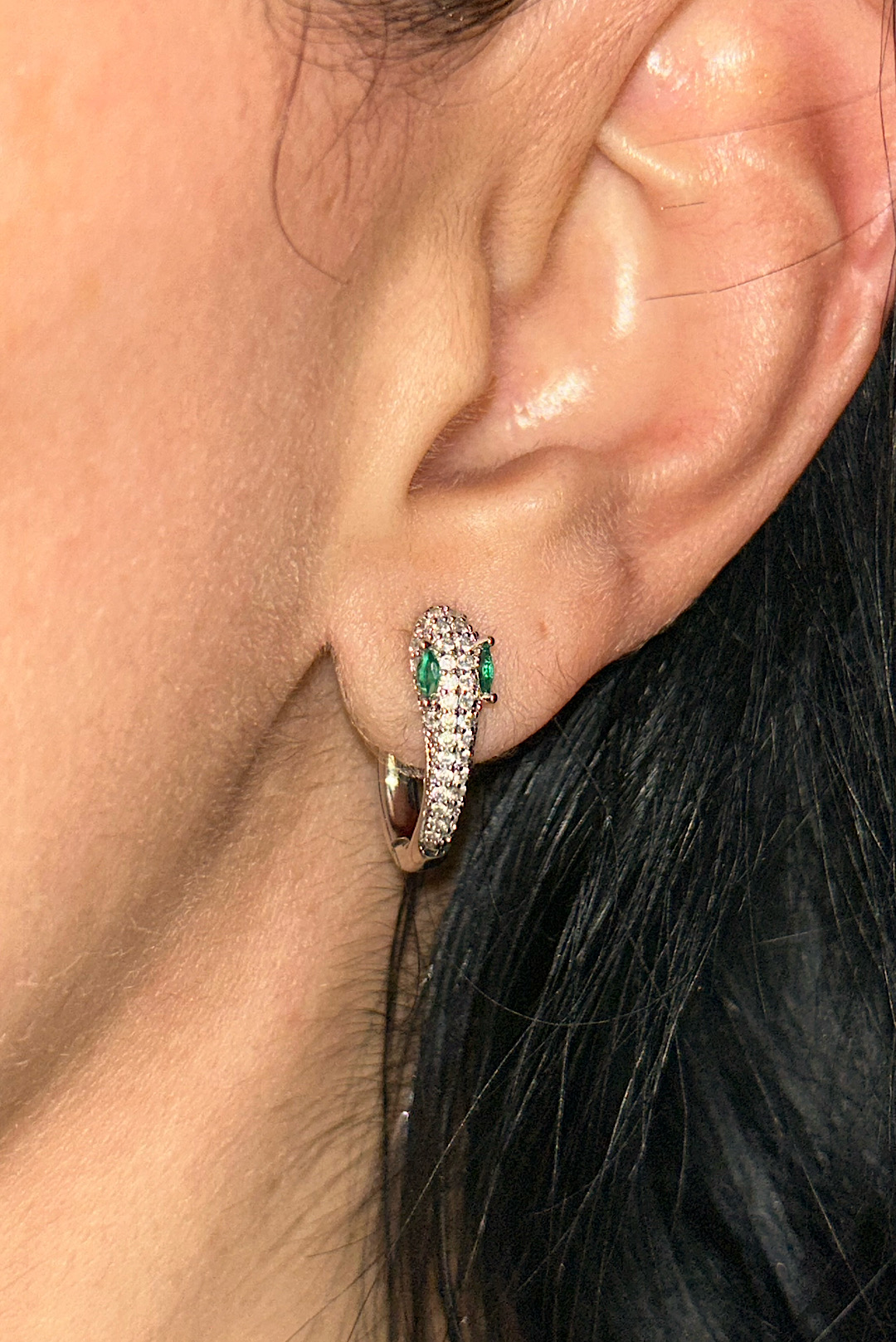 Μακρuά σκουλαρίκια σε σχήμα φιδιού με ασημί χρώμα και με πράσινες πέτρες