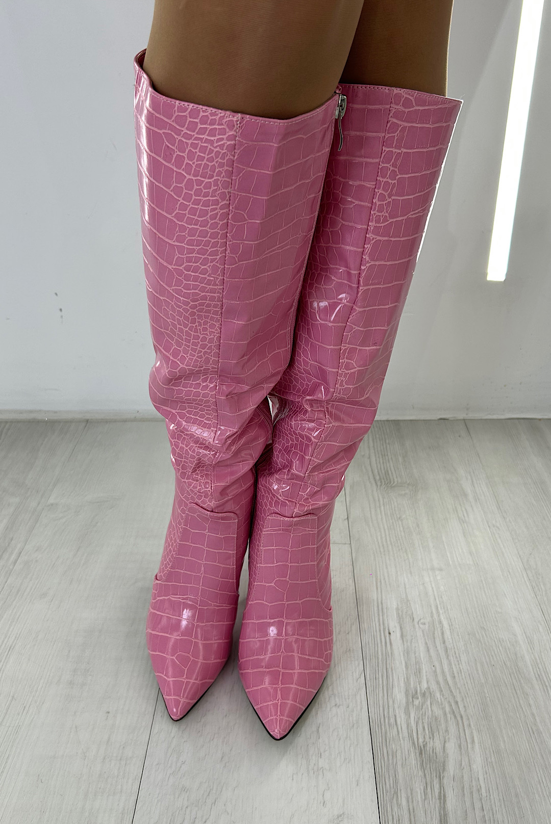 Crocus leather boots in black, green, pink and beige.